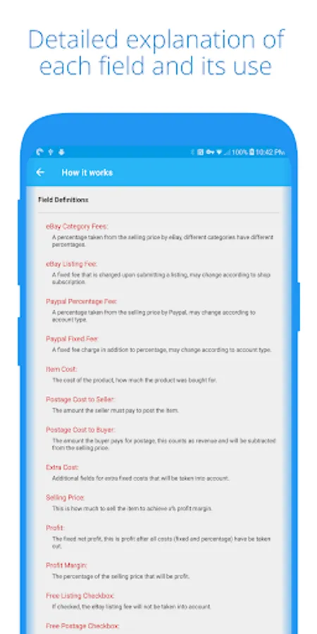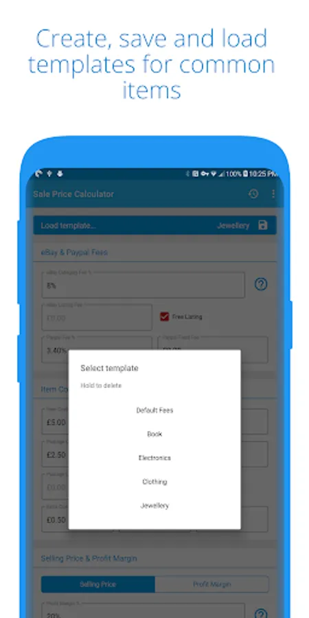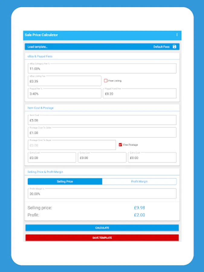 Sale Price calculates your selling price using eBay & PayPal Fees, item cost, postage and others to guarantee the profit margin you need.