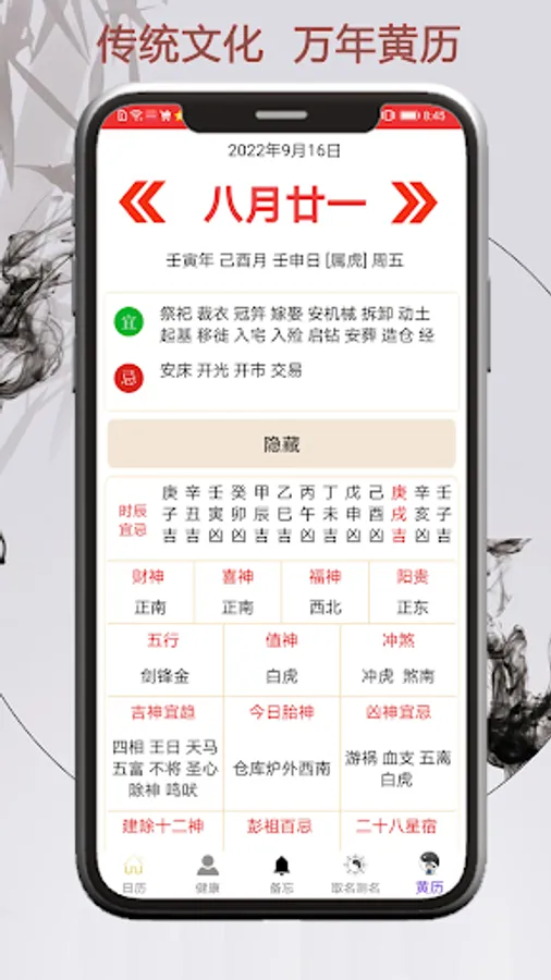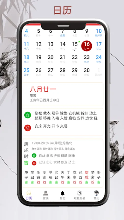 The Gregorian calendar and the almanac calendar can be switched freely; the taboos of today are clear at a glance.
