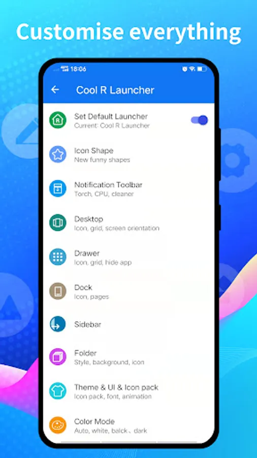 + Cool R Launcher has 3 Color Mode: light launcher mode, dark launcher mode, automatic mode