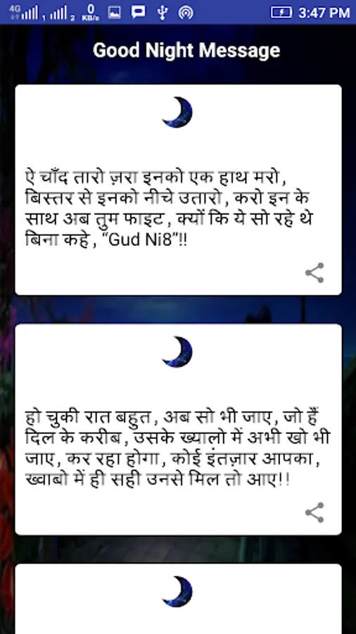 Great Night Messages application permit you to send/share great night messages to your friends and relatives to keep them happy.This is best collection of Good Night SMS.