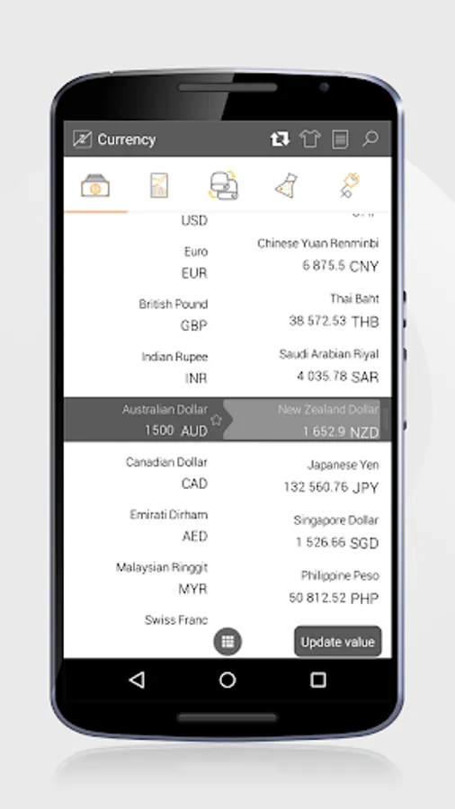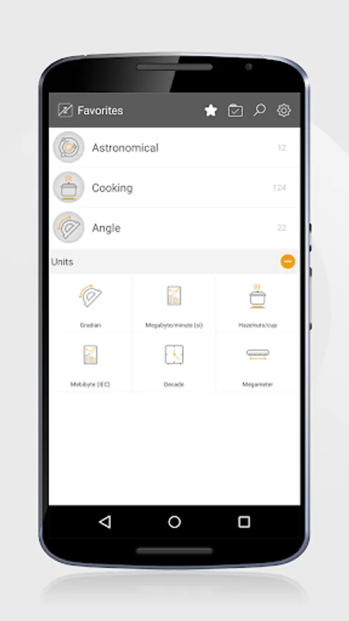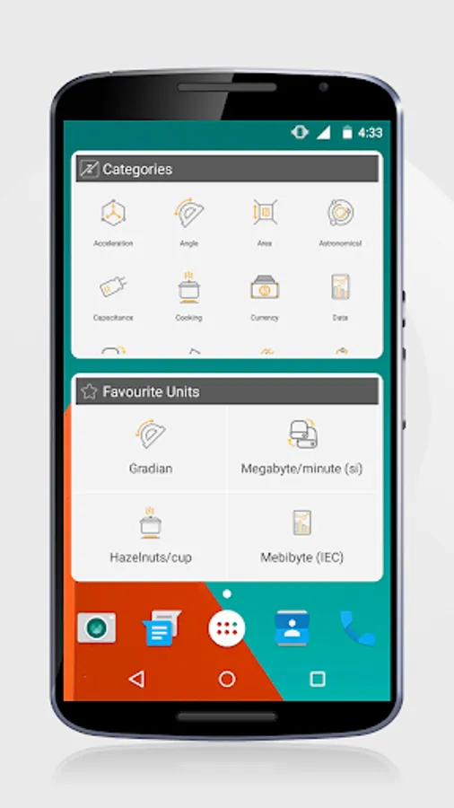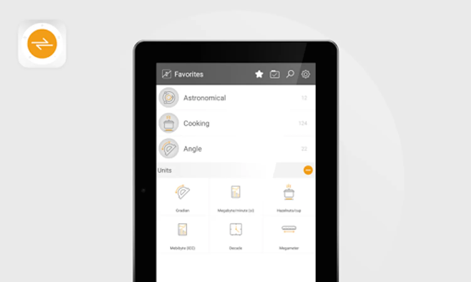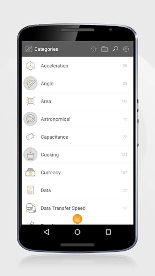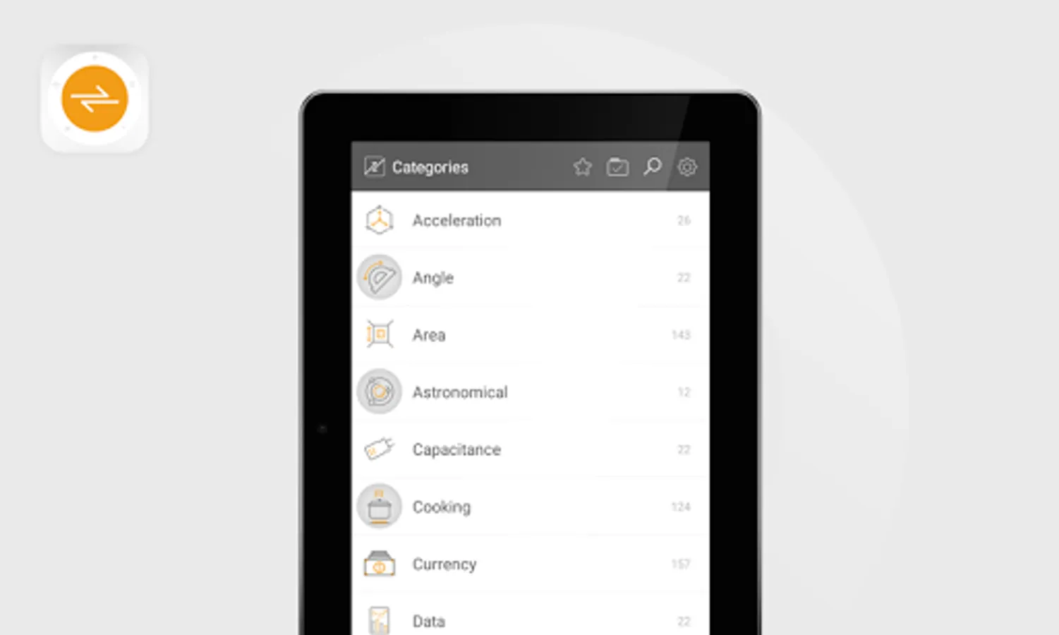 • Most usable units conversion includes: Acceleration, Angle, Area, Astronomical units, Capacitance, Cooking, Currency, Data size, Data Transfer speed, Density, Electric current, Energy, Force, Frequency, Fuel Consumption, IL luminance, Length, Light, Luminance, Mass, Metric Prefixes, Power, Pressure, Radio activity, Sound, Speed, Temperature, Time, Torque, Typography, Viscosity, Volume, Volumetric flow, Weight