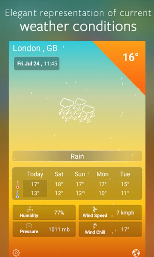• Provides only the useful weather information you may need on a daily basis: Humidity, Wind Speed, Wind Chill, Pressure and Visibility details