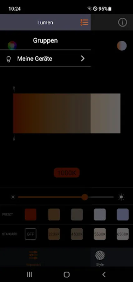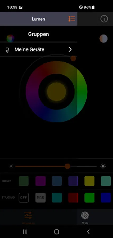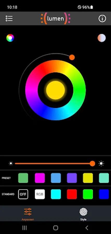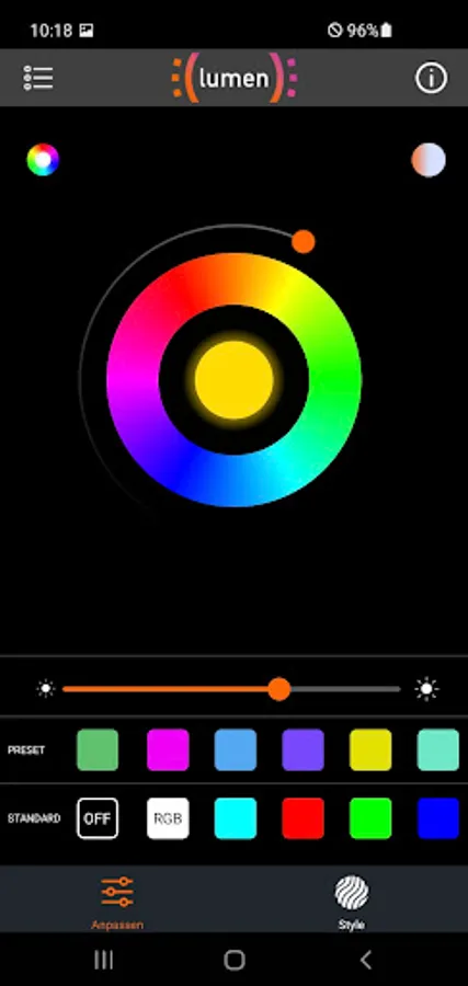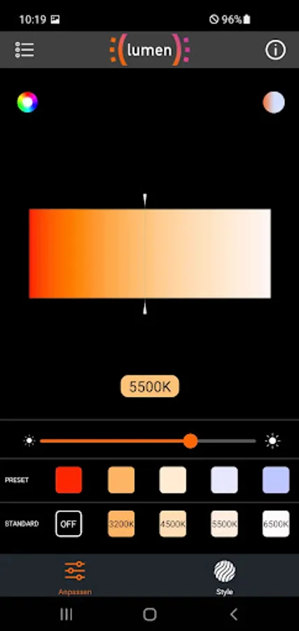 With the Lumen LED app, you are able to easily control the Lumen products using your smartphone. This way, you don't have to go to the device to change any settings. Simply take your mobile phone in your hand and use it to modify colors, intensities and gradients without having to move yourself or your model. Depending on the LED permanent light, you can choose between different color temperatures, 360 colors in RGB mode and different effects.