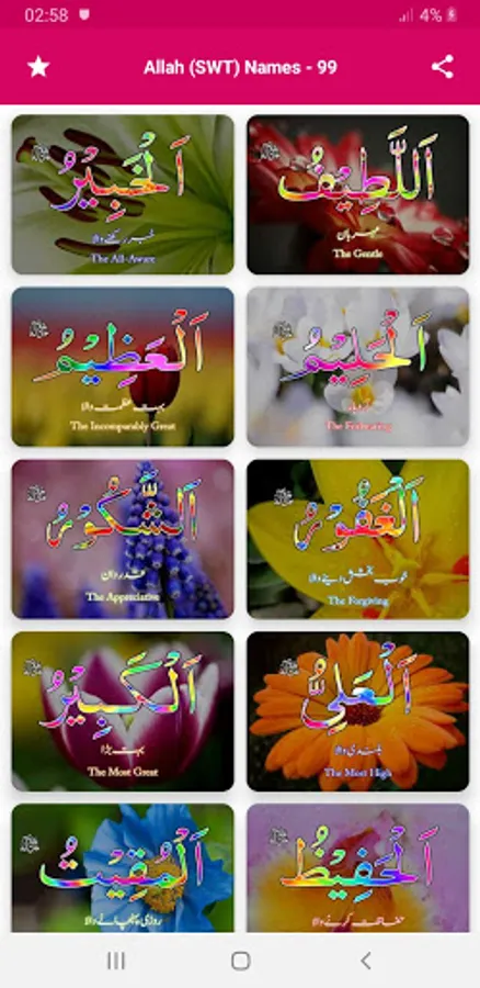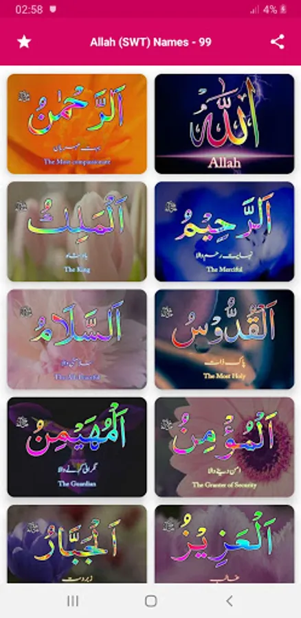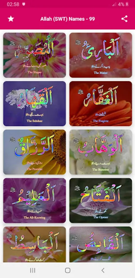 ASMA UL HUSNA with English and Urdu Translation also with Beautiful Graphical User Interface, Each name with Separate Background.