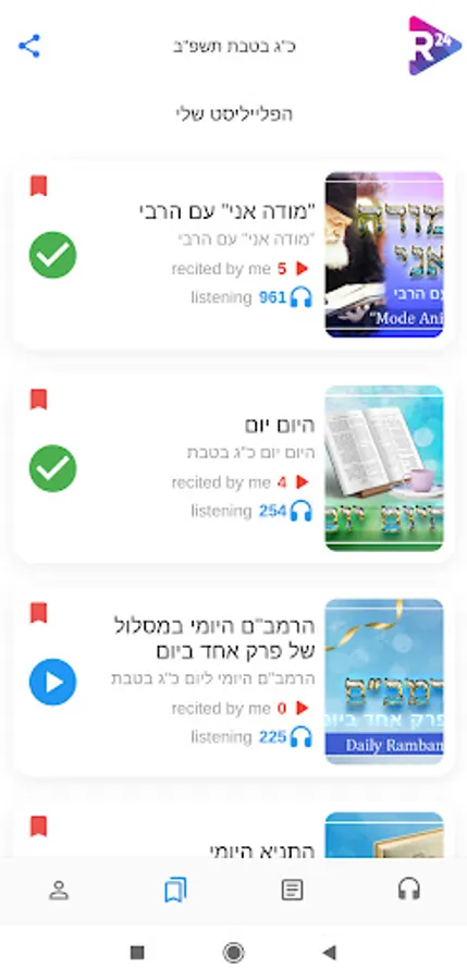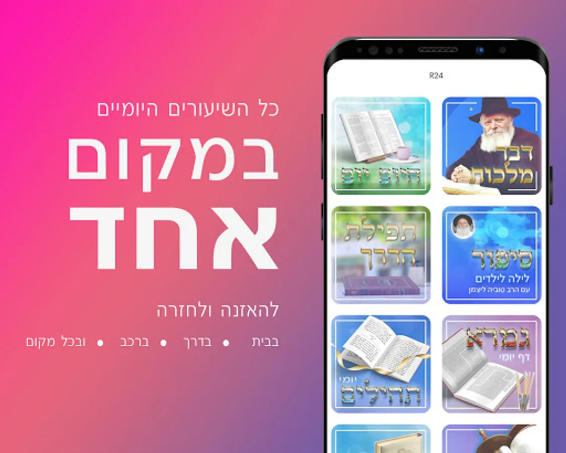 R24 נותנת למשתמשים את האפשרות, לומר את השיעורים היומיים גם בדרך, ללא צורך בקריאה מהכתוב. אפשר ללמוד את השיעורים , בבית, בנסיעה, בזמן ההליכה, או בכל מקום אחר, על ידי האזנה וחזרה.