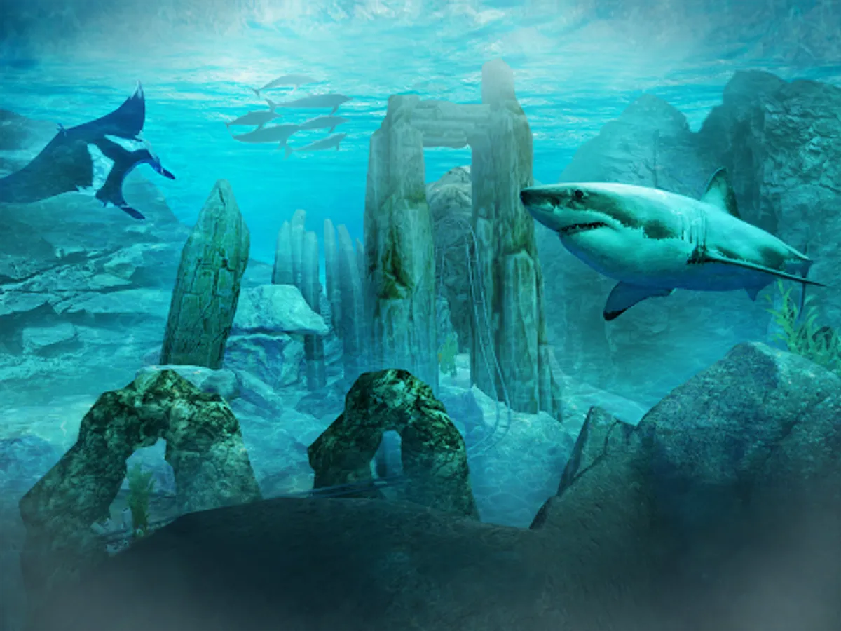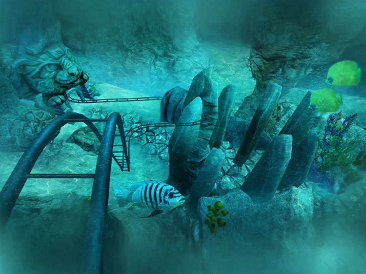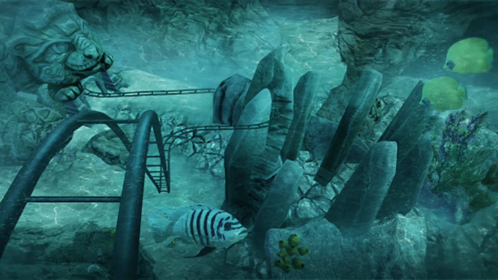 Feel how the roller coasters runs on the track through high- and low speed corners as you observe the detailed graphics of the ancient hidden temple. Run past trees and torches as you wiz by at ultra high speed! So much detail to observe... Are the temples Mayan, or maybe left by an alien race? No time to think as the journey continues to ride into the dark and scary caves and enjoy the sensation of gravity and speedy curves as you pass through the subterrane. Ultimately you'll dive into the water and be treated to an amazing underwater experience. See tropical fish in full animated detail as they life their underwater life. Just when you think the virtual reality (VR) sea life is all about beautiful coral and colorful fish you'll see a hungry shark emerge on your coaster path as a dangerous predictor roaming the open sea.