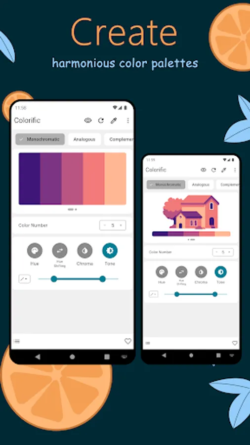 ·Create - Generate a stunning color palette with just one click, featuring a range of color schemes including monochromatic, analogous, complementary, split-complementary, double complementary (tetradic), and triadic colors."
