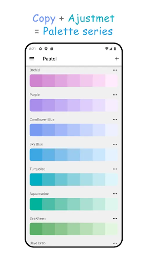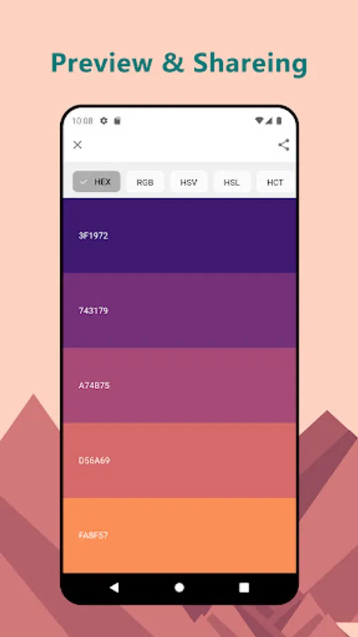 · Share - You can easily copy the color codes of your palettes or share them as an image. Color codes such as Hex, RGB, HSV/HSB, HSL, LAB, and HCT are all supported for exporting and sharing.