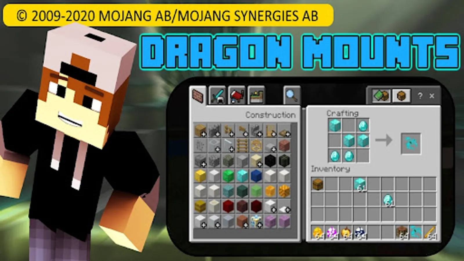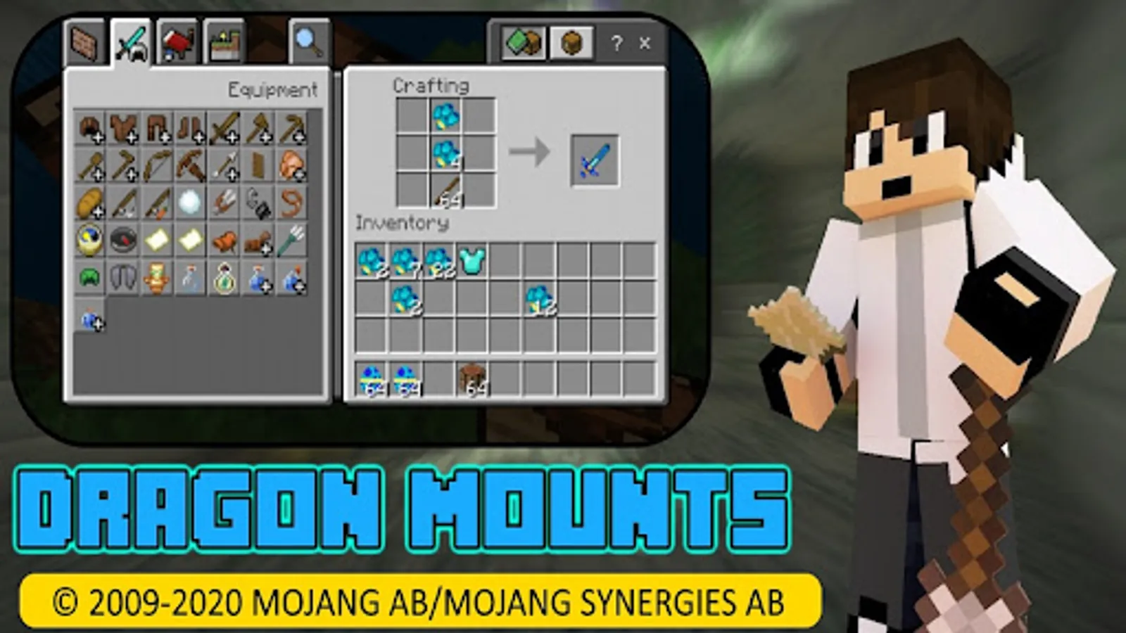 This dragons mod adds 17 mcpe dragons, lots of new armor, and many new swords! Now you can have more fun in MCPE! All the dragons in Dragon Mounts except the ghost dragon have their own custom armor, sword, and scale. To equip the armor, long press on the screen, or right click. You can also equip a saddle, chest, and horse armor on the dragons. All dragons have a hostile and tameable version. The tameable versions are not flying. All dragons drop scales.