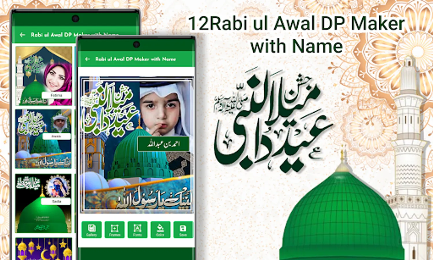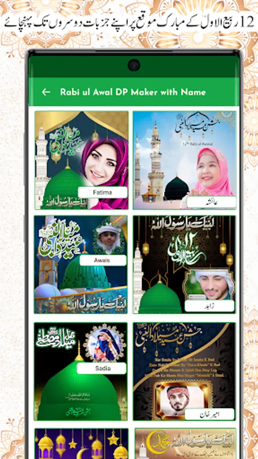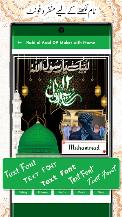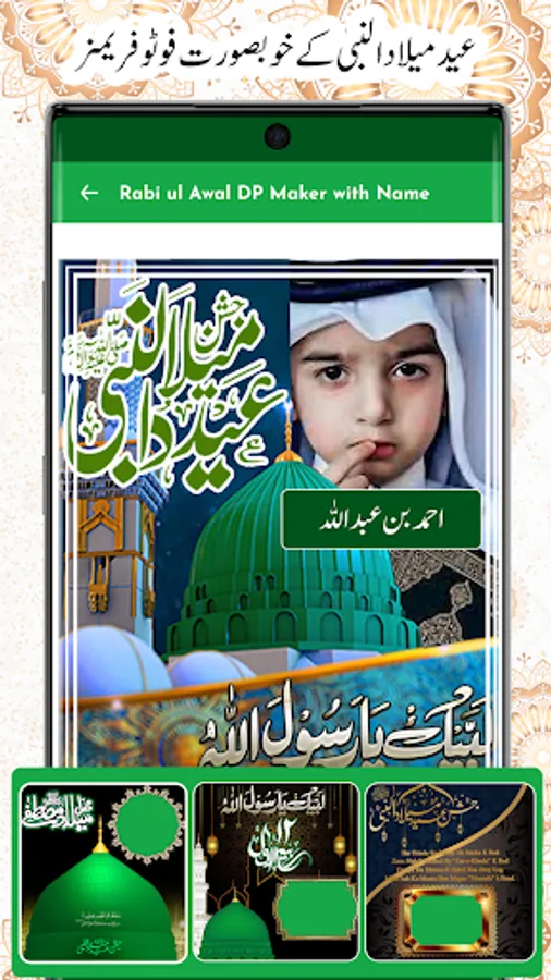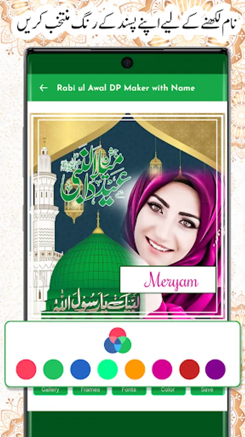 This rabi ul awal name image frame is a fan based photo frames editor with name dp maker to make awal eid milad urdu name DP For Whatsapp Facebook And other Social Media. Create your own eid milad un nabi profile photos. 12 Rabi ul Awal Urdu Name dp maker is outstanding photo editing app you can write text on dp very easily in few seconds on the occasion of milad eid day.