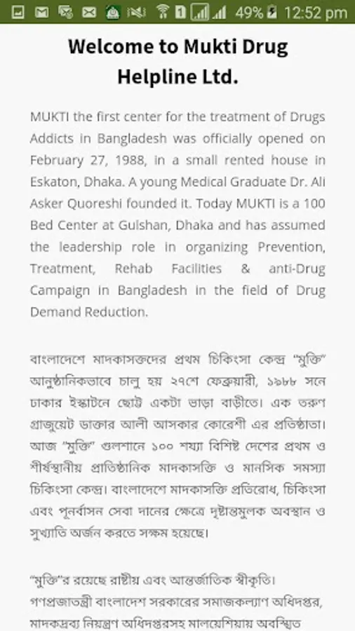 MUKTI the first center for the treatment of Drugs Addicts in Bangladesh was officially opened on February 27, 1988, in a small rented house in Eskaton, Dhaka. A young Medical Graduate Dr. Ali Asker Quoreshi founded it. Today MUKTI is a 100 Bed Center at Gulshan, Dhaka and has assumed the leadership role in organizing Prevention, Treatment, Rehab Facilities & anti-Drug Campaign in Bangladesh in the field of Drug Demand Reduction.