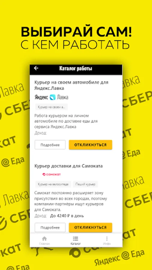 Our application contains current job offers for couriers with food delivery services, such as Yandex Food, Lavka, SberMarket, Delivery Club (Delivery Club), Samokat.
