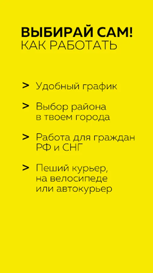 By installing our application, you get access to the database of work for couriers, which is updated and updated daily. Our application will be useful both for those who are just looking for a job as a delivery courier, and for those who are already working - you can always try working with another delivery service.