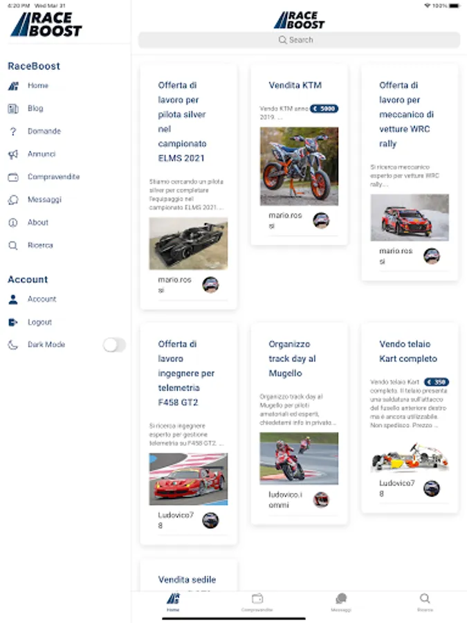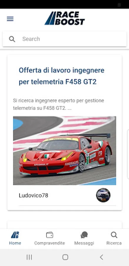 App for communication between professional and non-professional figures in the world of Motorsport (in general in motor racing, karting, motorcycling and gaming), it favors the exchange of contents, there are demand and offers of work and information on professional figures (CV , photos, videos, etc ...)