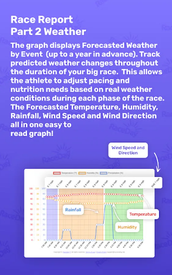 RaceDay empowers you to quickly create a personalized and comprehensive race plan tailored to your strengths and goals. Say goodbye to generic plans, as you can now factor in your swim, bike, and run "pace" alongside your hydration plan and nutritional preferences. But that's not all; RaceDay takes your race experience a step further by incorporating real-time, forecasted weather conditions at your race location to fine-tune your strategy.
