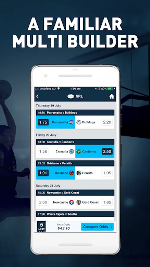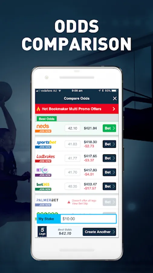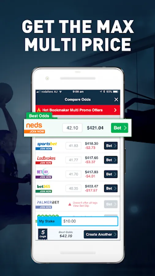 Compare multi bet odds pricing for the following bookmakers: Sportsbet, Neds, Ladbrokes, Bookmaker, Betstar, Beteasy, Unibet, Palmerbet, Bet365, TAB.