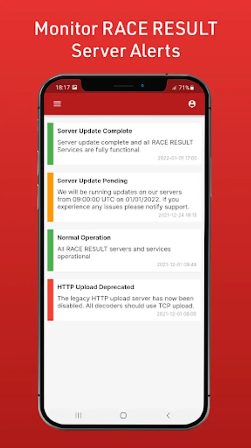 With RACE RESULT Aurora you can now monitor your RACE RESULT systems remotely, receive push notifications about your online timing systems, and receive the latest server updates directly on your phone.