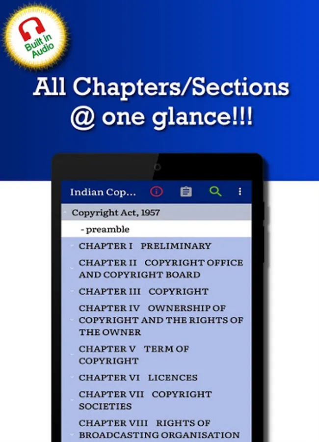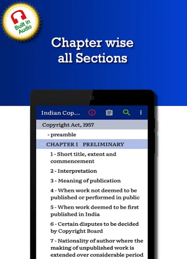 ‘Copyright Act 1957’ is the Best Copyright Act learning App with latest Amendments. It is a free and offline app providing detail Section-wise and Chapter-wise Legal Information of Copyright Act of India.