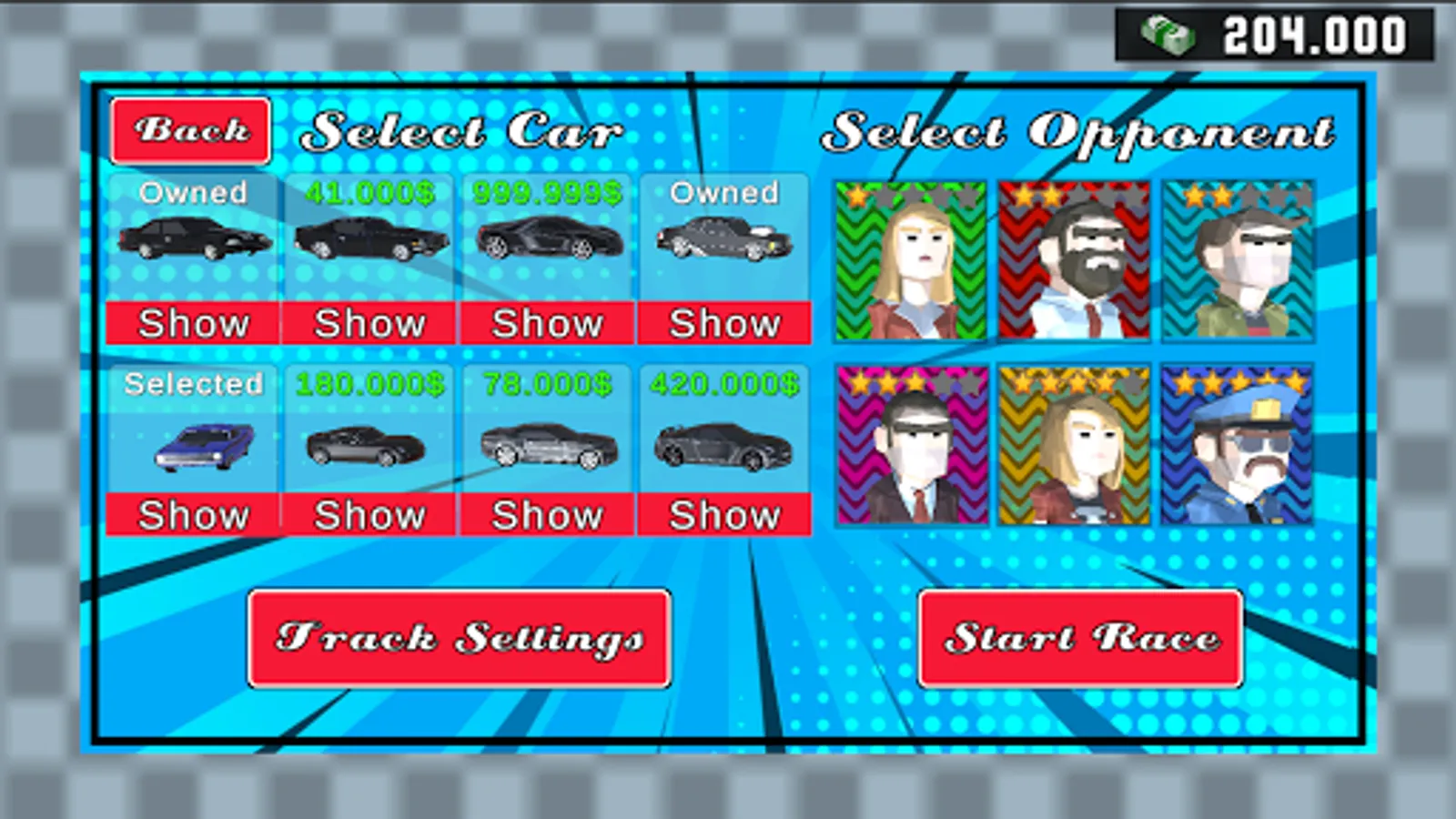 Select from a variety of options to create your own tracks and then challenge your friends to race on them. The game is 100% free without ads! You can also play against different AI opponents to earn money and unlock new cars.