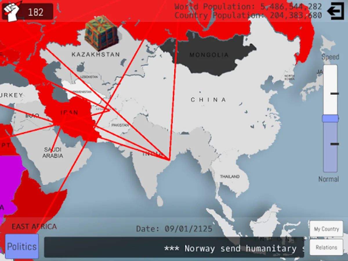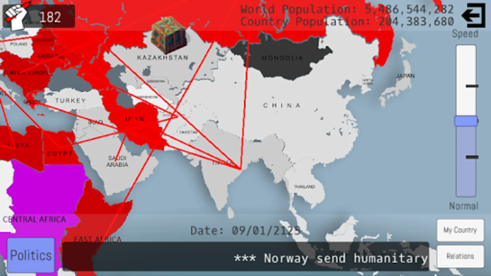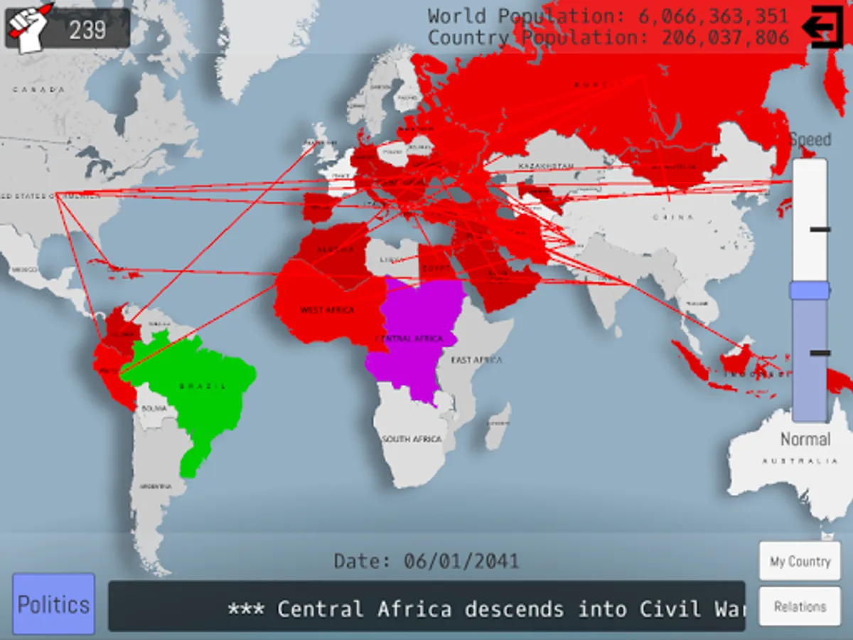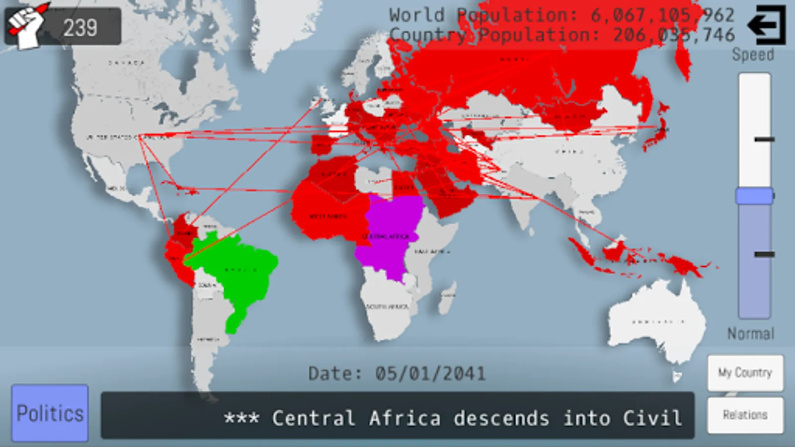 In this simulation it's all about global conflicts. Try to stay alive and play enemy countries against each other. Decide the right politics at the right time and your country will prevail.
