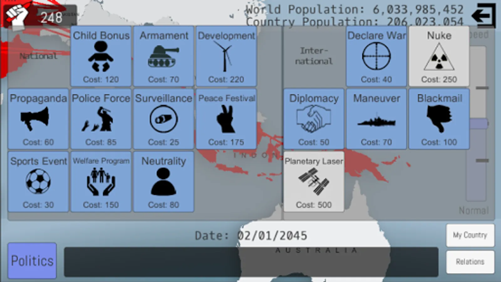 Select one of more than 50 actual countries with different attributes like infrastructure, population, military force or stability and make it the dominant force in the world. Improve relations, blackmail other leaders, nuke enemy countries or try to fight terrorism.
