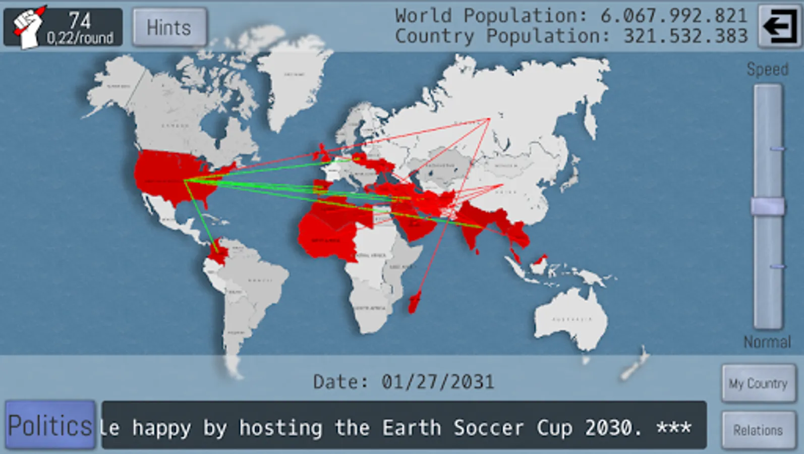 Select one of more than 50 actual countries with different attributes like infrastructure, population, military force or stability and make it the dominant force in the world. Improve relations, blackmail other leaders, nuke enemy countries or try to fight terrorism.