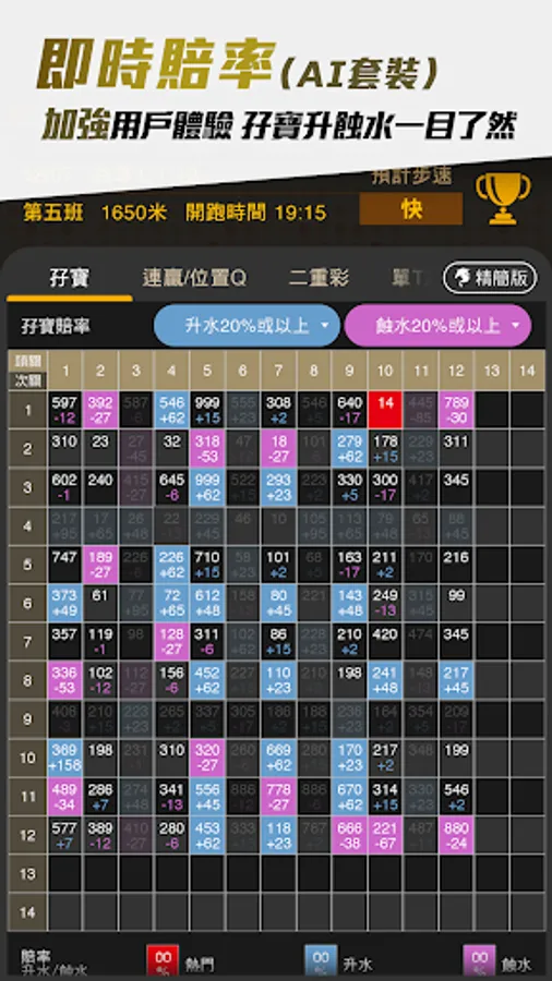 "Instant Odds": Provides the latest odds of winning streak, position winning streak, double lottery and double treasure odds.