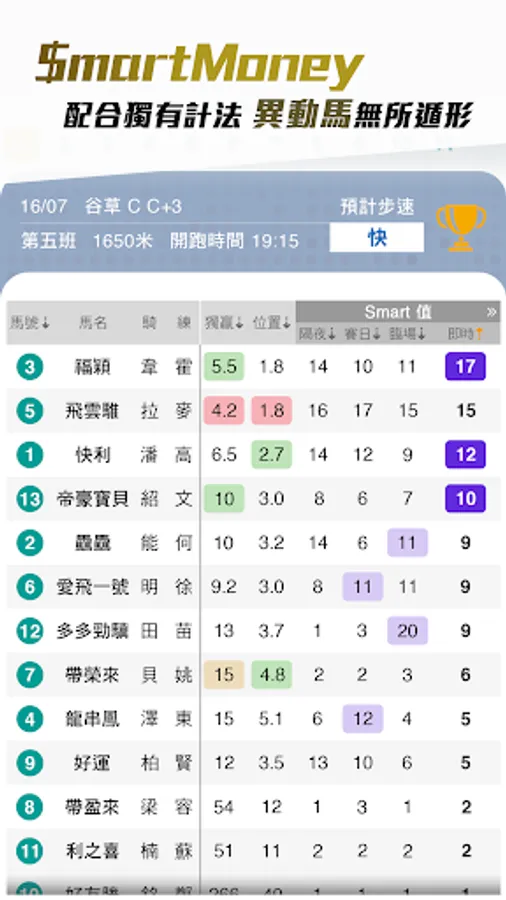 "$martMoney" uses its unique and sophisticated method to monitor the horses around the clock. At different times, the situation of different betting pools is converted into numerical values, which simply helps horse fans understand the flow of funds in the actual betting pool.