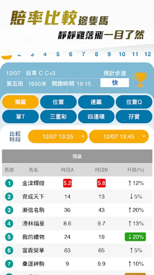 - "Odds Comparison": Users can adjust the time by themselves and compare the odds changes of horses in each period of time.