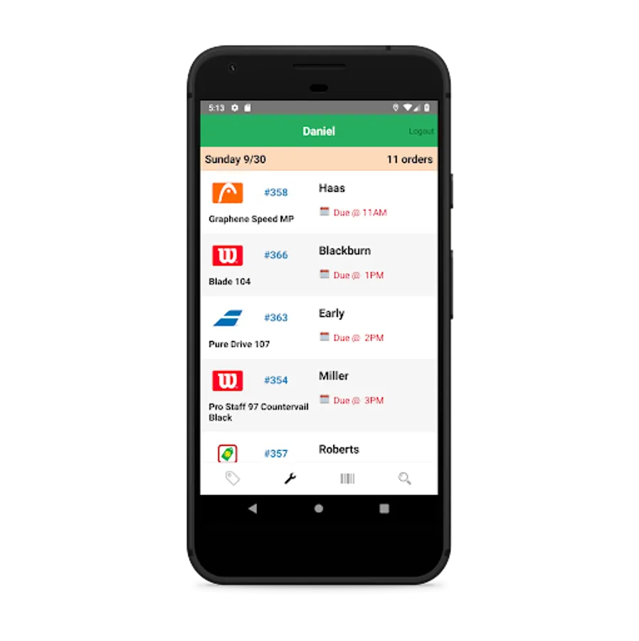 RacketLogger is an app for Tennis (and other Racquet Sports) shops, as well as their stringers. It's designed to check customer rentals (demo racquets) in and out. It also enables the easy taking of stringing and racquet service/repair orders.
