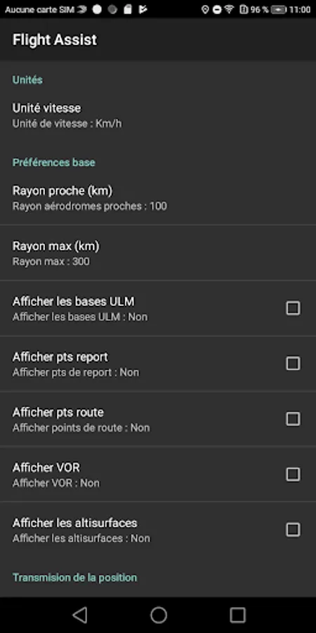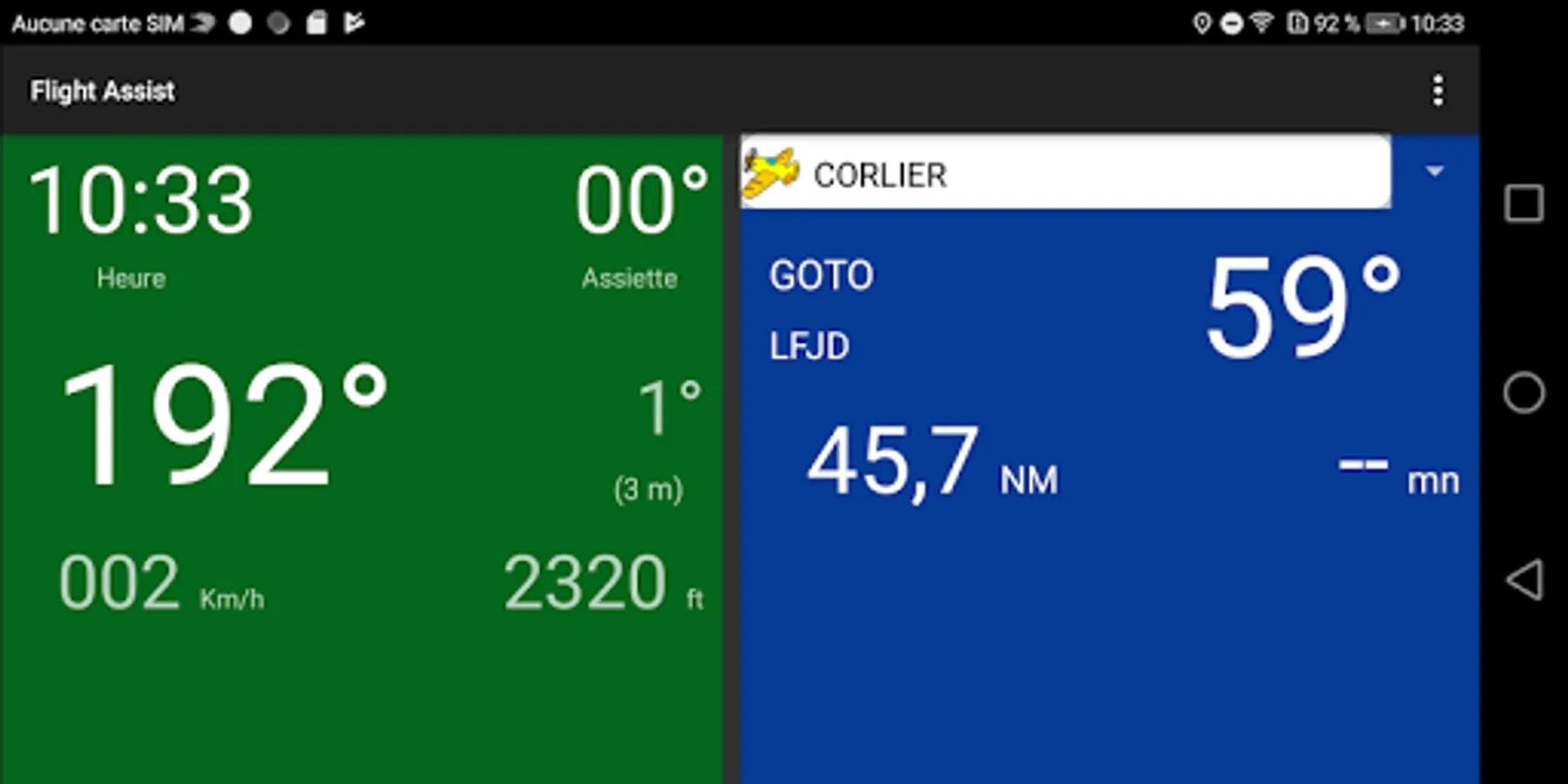 This wizard gives you the main navigation information (route, time, time, speed, altitude) and possibly a goto to an aerodrome saved in a downloadable xml database.