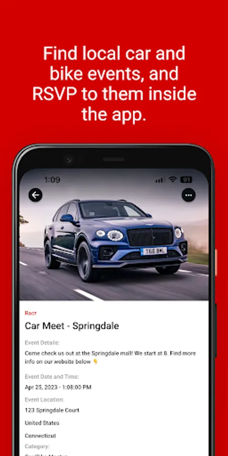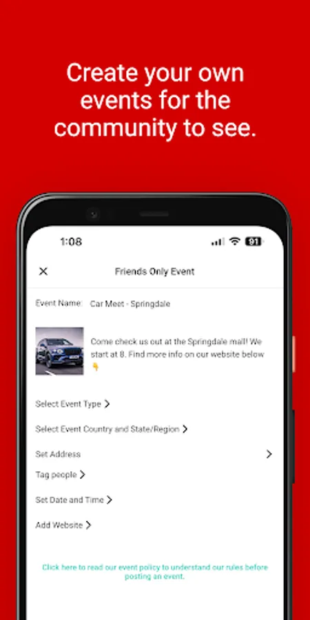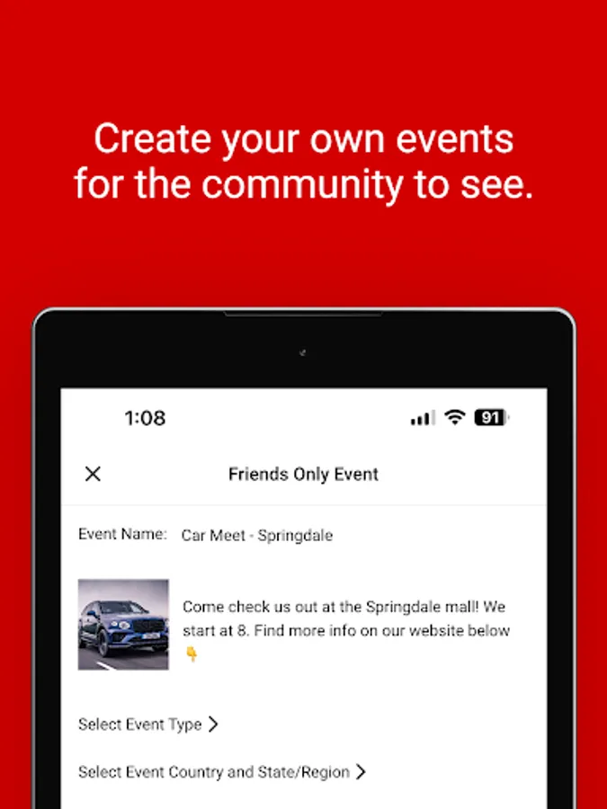 Create events for automotive-related activities such as car shows, off-road events, race events, meetups, or other gatherings, and can also specify the date, time, and location, and invite your friends by tagging them. You can also search for upcoming events in the local area or beyond through our search function.