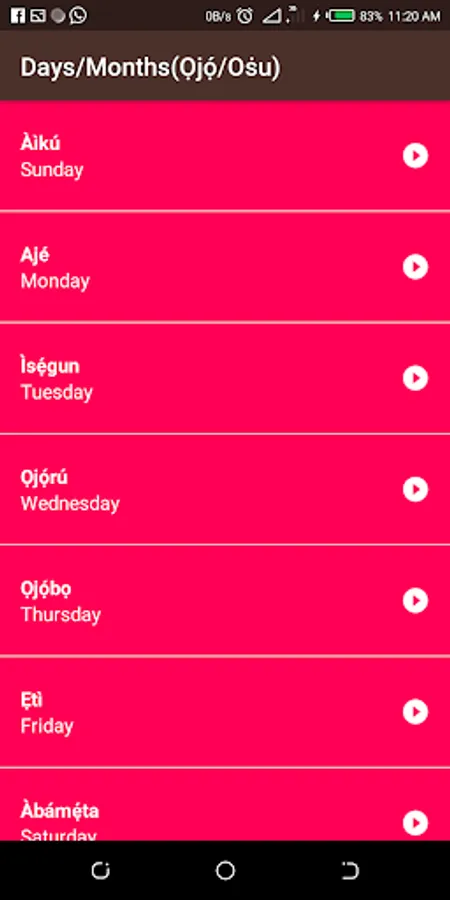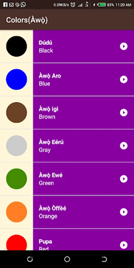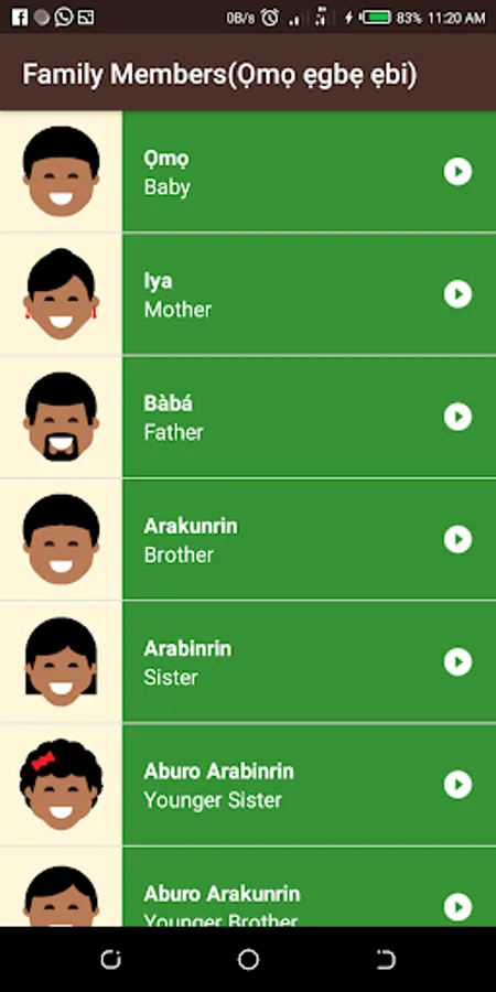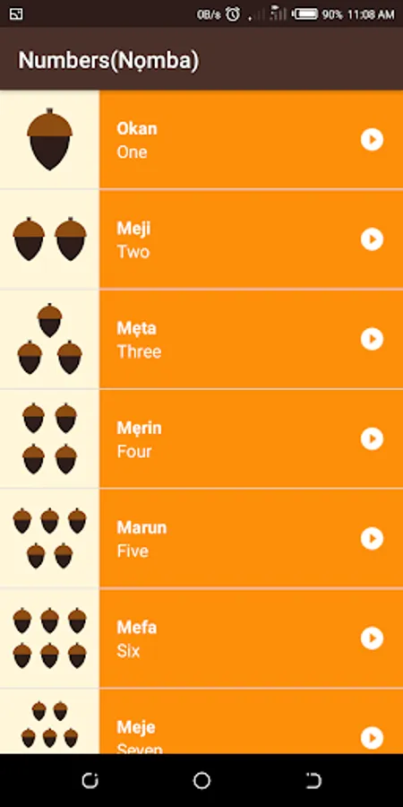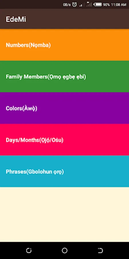 Edemi app allows users to understand more about the Yoruba language. It is a version an app developed by Google learnt on Udacity it uses array adapter and listview. It shows numbers, family, common phrases, colors, days of the week and months of the year and displays the translation of each of these in Yoruba.