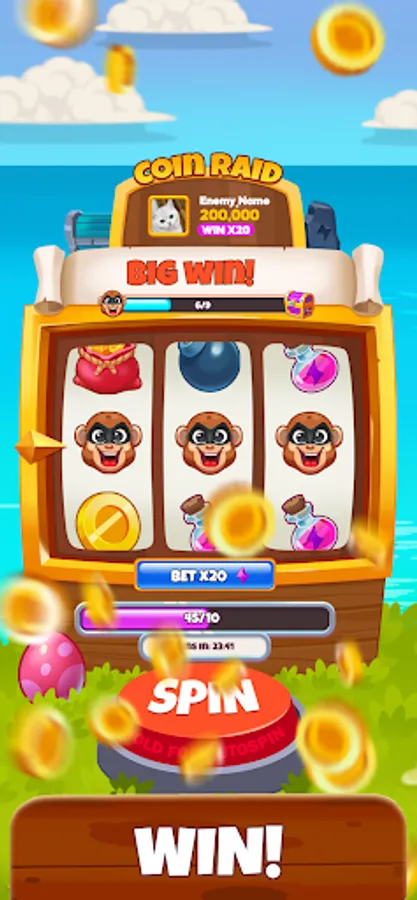 Collaborate with your friends, spin slots, build your own and raid others' villages with Coin Raid!
