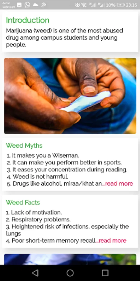 It is designed in such a way that these topical issues are themed; videos are included to make it interesting and contacts, where young people can seek help, are included at the end of each topic. Features limited to the University of Nairobi students are chats, forum, and counseling services in the institution's facilities.