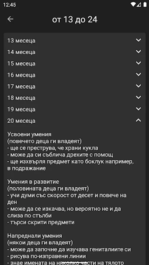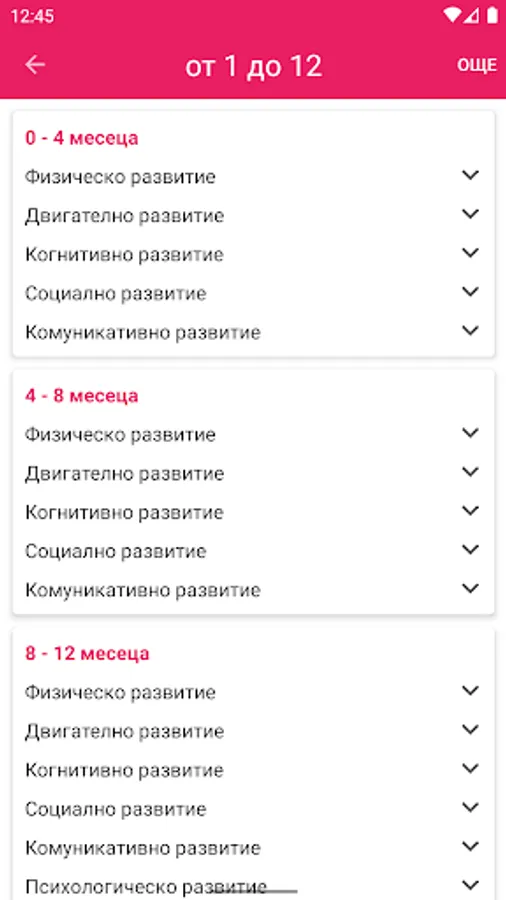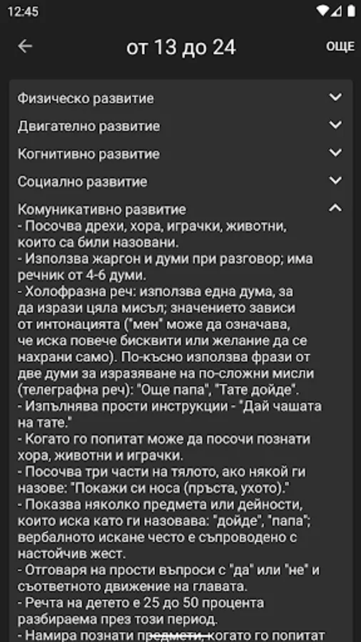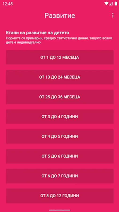 Програмата проследява възрастта на детето и текущото му развитие. Тя дава информация за развитието на детето от раждането до 12 годишна възраст. Чрез нея ще можете да проследите: