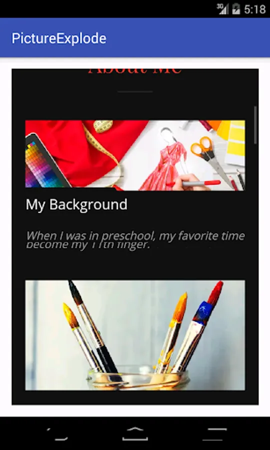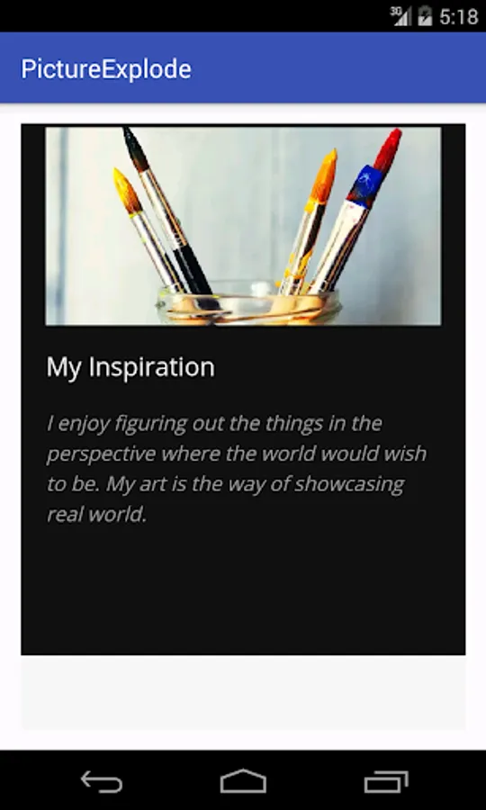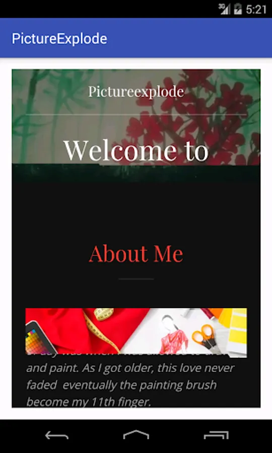 The Pictureexplode is an application where the art of the author is explored. The paints and art are related to the present circumstances which are seen by the rest of the word. Every moment is given in pictorial representation no matter about what it is. The main idea of the author is to showcase her talent to the real world in form her artistic nature.The thoughts are given in the form of picture. The present news feeds are also posted in pictorial representation, where the world can look into. The other perspective of the application is also to show the art of the author where the viewers can subscribe to her application and place order of the paintings if interested.
