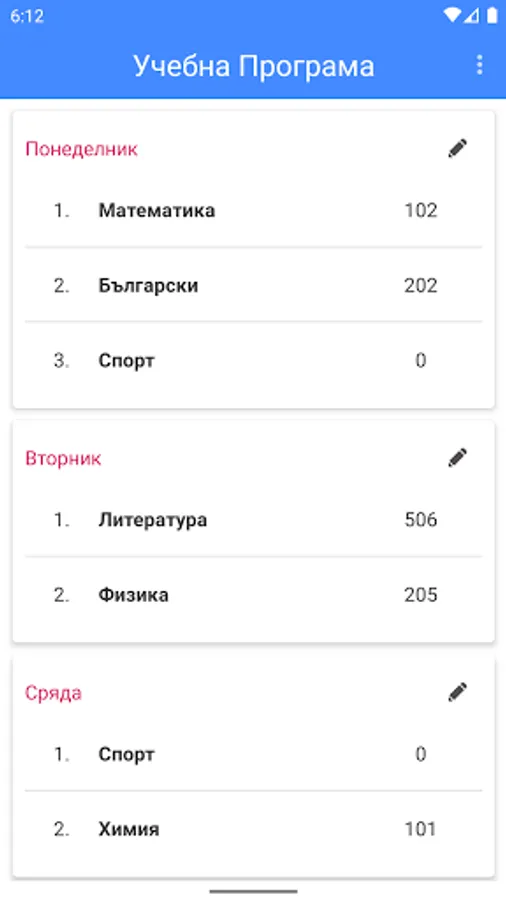 Приложението е много функционален органайзер за въвеждане на учебната програма на учениците. За всеки ден от седмицата можете да въведете неограничен брой предмети, да добавяте дупки (свободни часове), да добавите стая към всеки предемет, както и начален час на занятията.