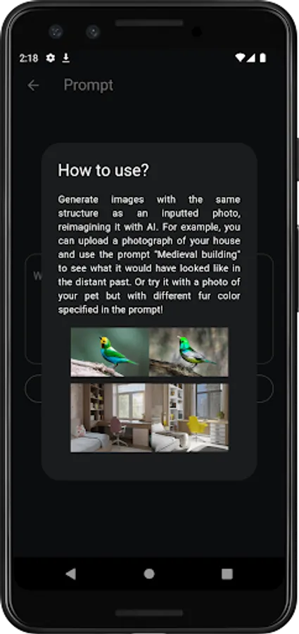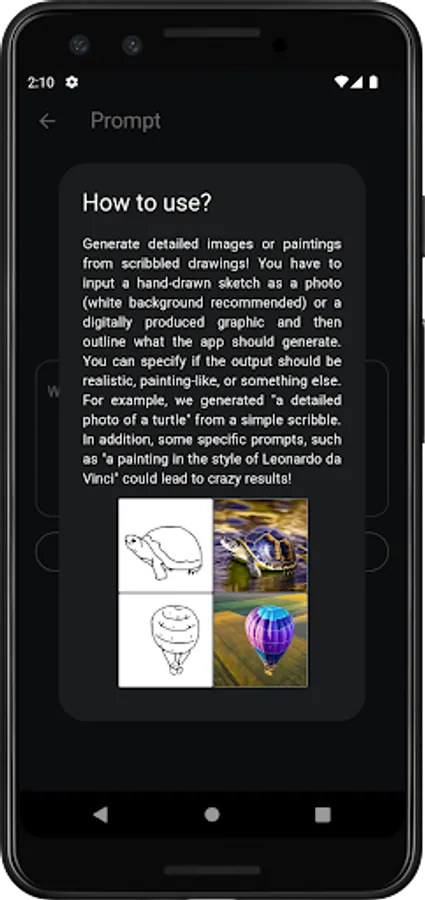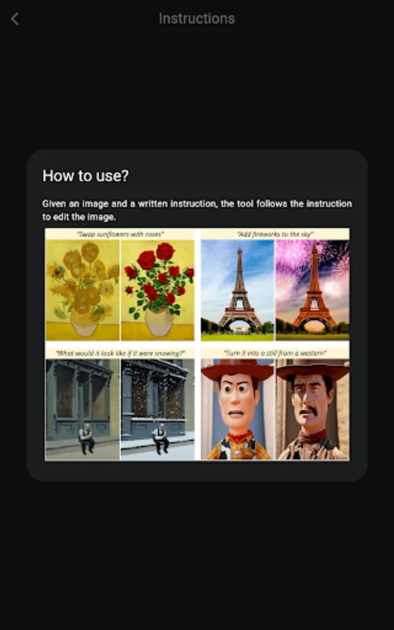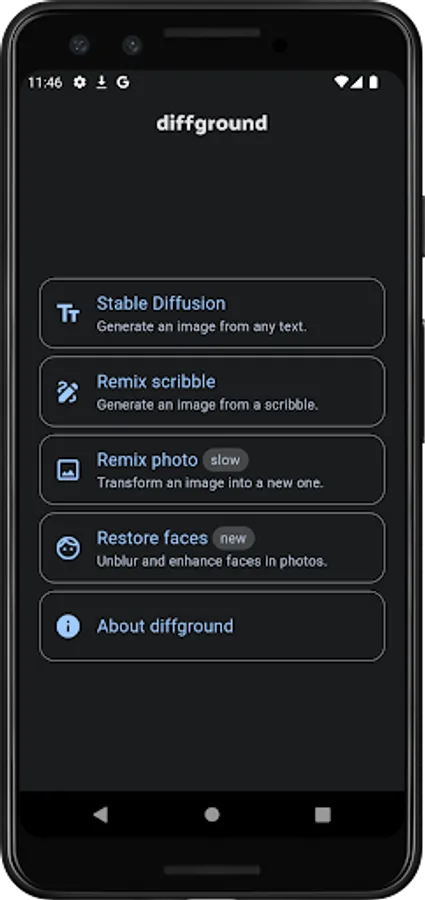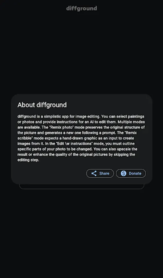 diffground is a simplistic app for image editing. You can select paintings or photos and provide instructions for an AI to edit them. Multiple modes are available. The "Remix photo" mode preserves the original structure of the picture and generates a new one following a prompt. The "Remix scribble" mode expects a hand-drawn graphic as an input to create images from it. You can also upscale and enhance the quality of your photos or generate completely new images from text.