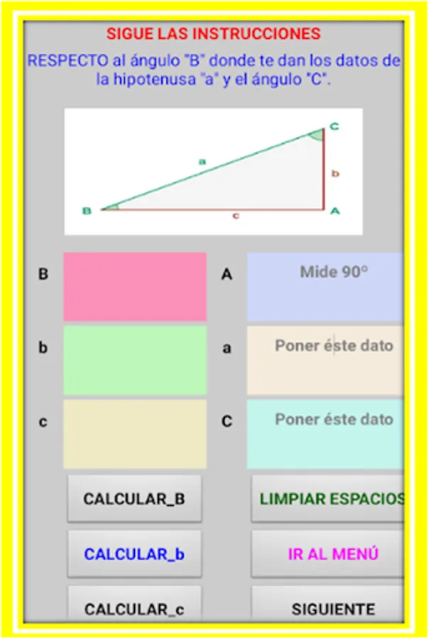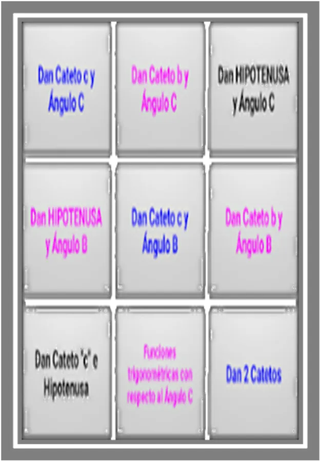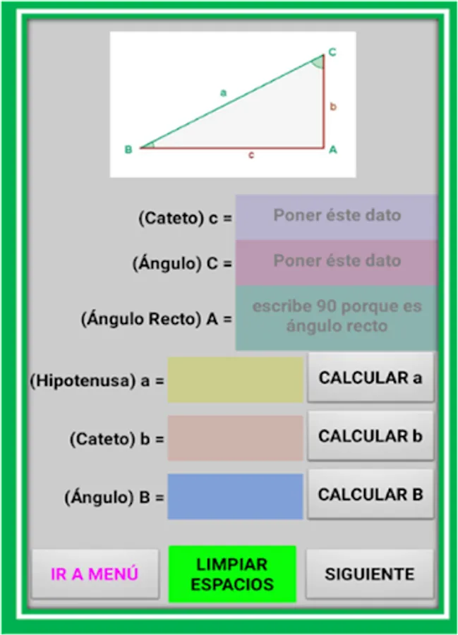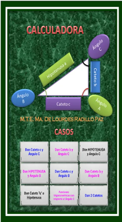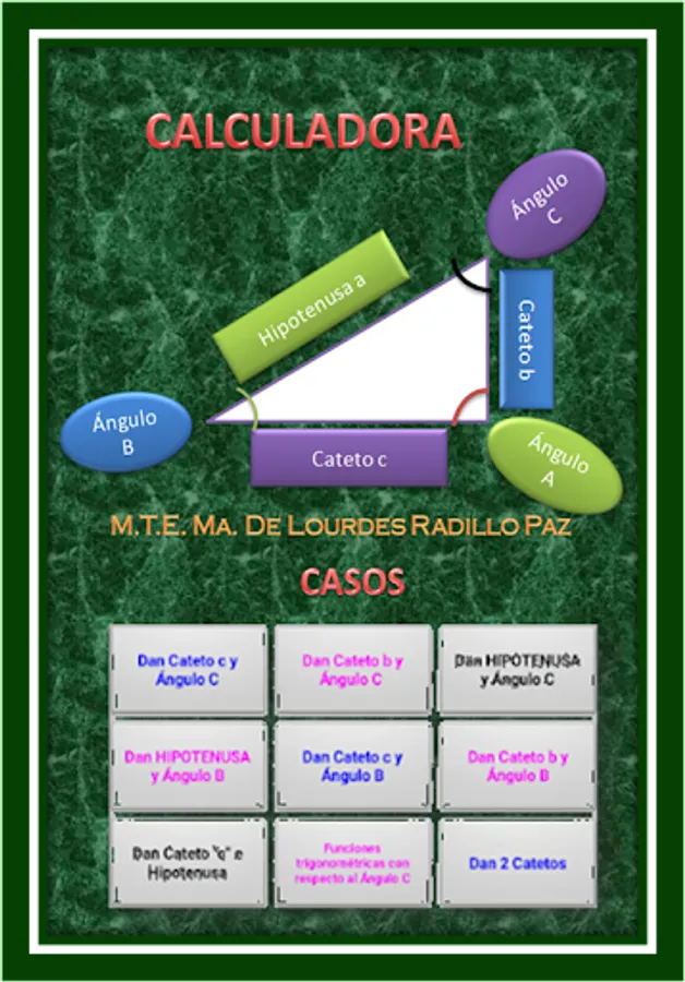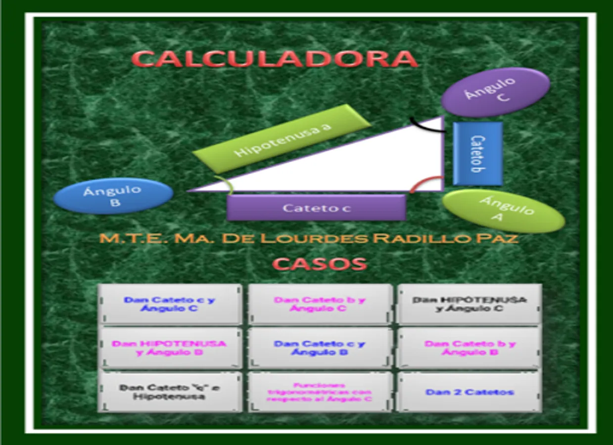 IT IS A CALCULATOR THAT IS USEFUL TO OBTAIN THE MEASURES OF THE SIDES AND ANGLES OF A RECTANGLE TRIANGLE, VARIOUS CASES WHERE THE MEASURES OF SOME SIDES AND SOME ANGLES.