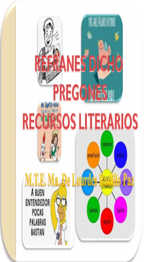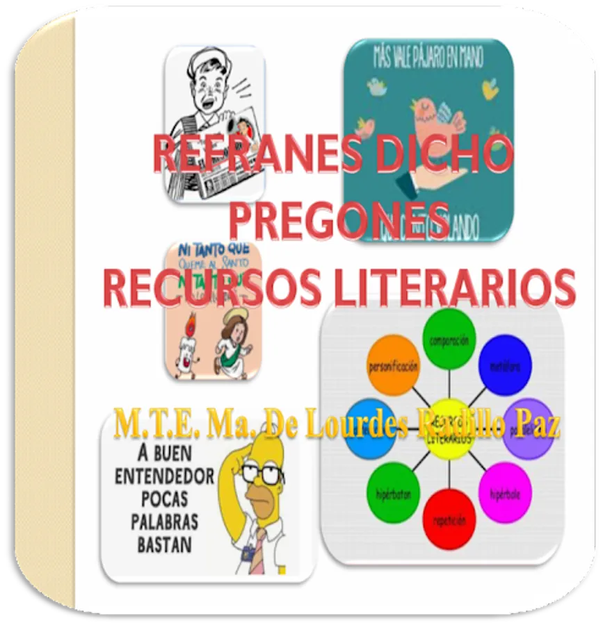 Contains: Sayings, sayings, cries. Literary resources: Contrast, Analogy, Metonymy, Synecdoche, Hyperbole, Anaphora, Comparison, Antithesis, Metaphor, Hyperbaton, Oxymoron, Synesthesia. Rhyme, meter, alteration. Also, types of cards and their characteristics. All with definitions and examples.
