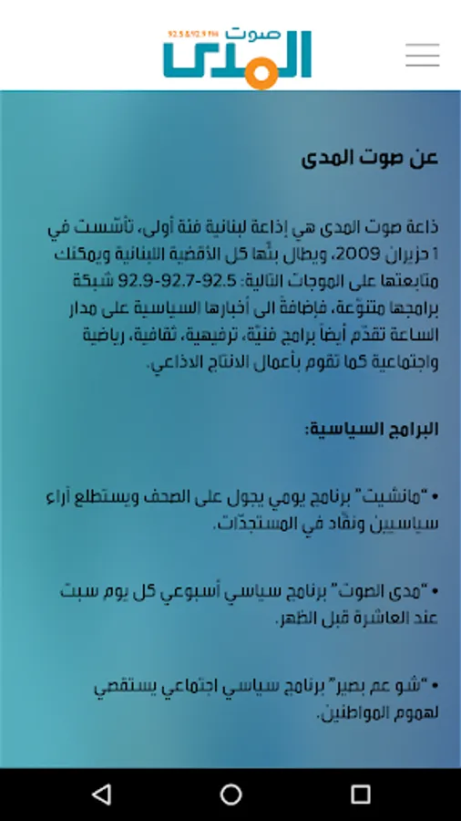 إذاعة صوت المدى هي إذاعة لبنانية فئة أولى، تأسّست في 1 حزيران 2009، ويطال بثّها كل الأقضية اللبنانية ويمكنك متابعتها على الموجات التالية: 92.5-92.7-92.9