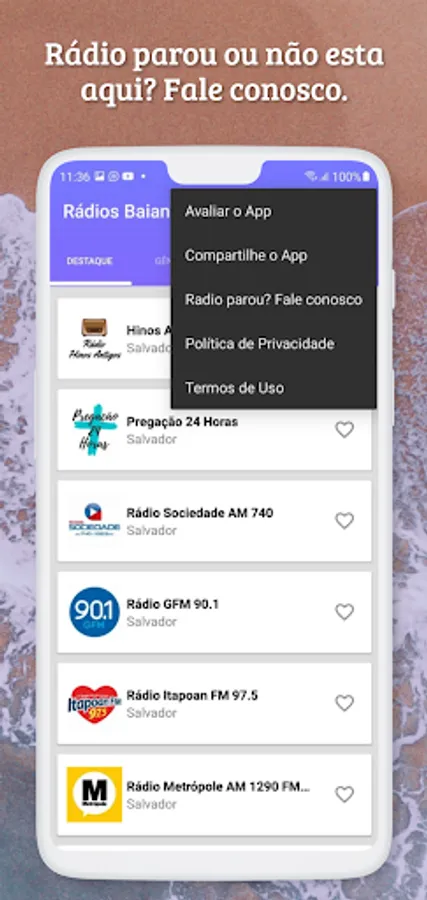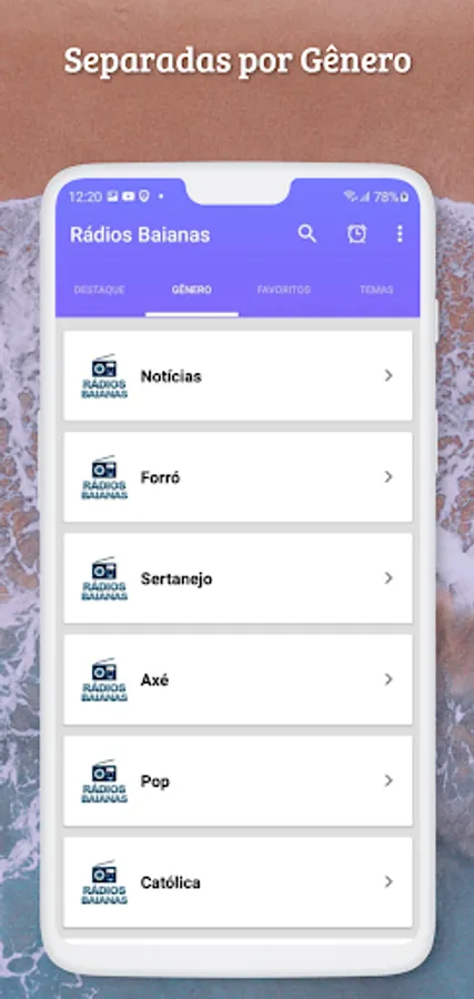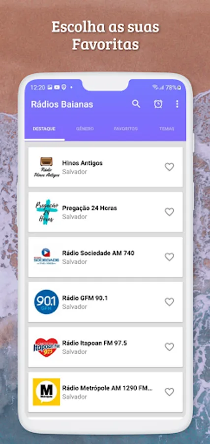 In it you listen to the online radio from all over the State of Bahia in the various categories such as Ax, Pop, Rock, Gospel, Football, Country, Forró, Sports, Journalism, Catholic, Eclectic and Community.