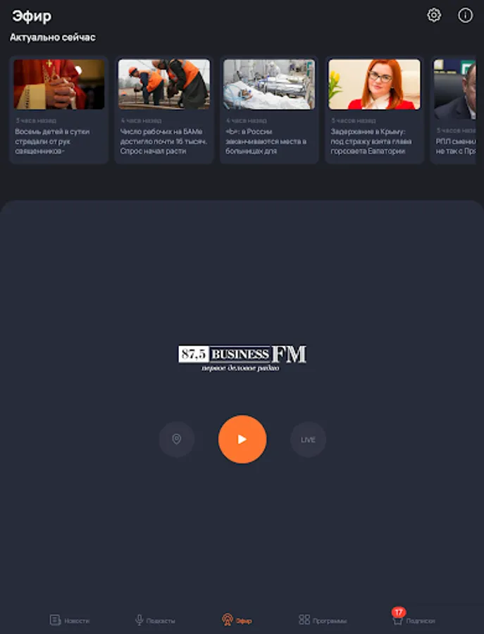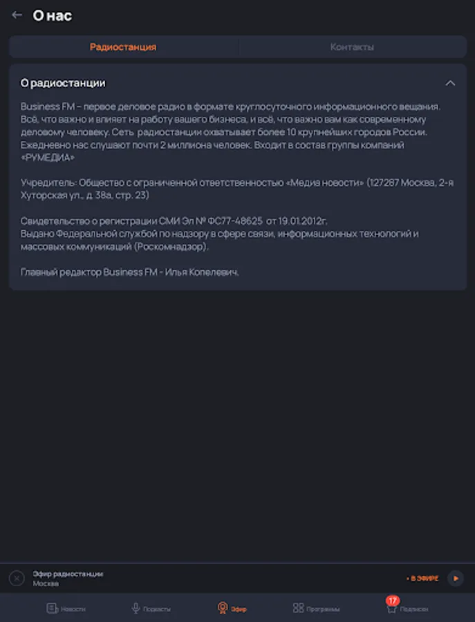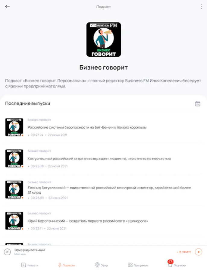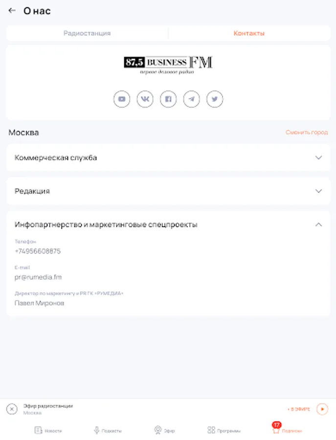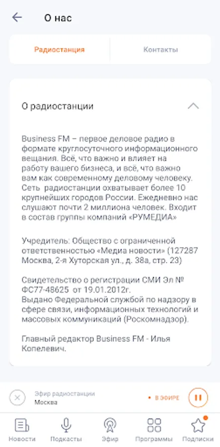 Listen to the BusinessFM broadcast to choose from: Moscow, St. Petersburg, Barnaul, Yekaterinburg, Kazan, Kaliningrad, Krasnoyarsk, Nizhny Novgorod, Novosibirsk, Ufa, Chelyabinsk.
