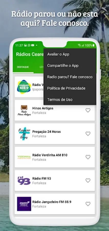 Listen to everything! Radios from the capital Fortaleza and from all over the country: "Rádio Verdes Mares 810 AM Verdinha", "Rádio Shalom 690 AM", "Rádio Selá FM", "Rádio 93 FM" "," Rádio Aleluia 99.9 FM "," Rádio Assembly 96.7 FM "," Rádio Assunção Cearense 620 AM "," Rádio Atlântico Sul 105.7 FM "," Rádio Benção 88.5 FM "," Rádio Benfica 87.9 FM "," Rádio Cidade 860 AM "," Rádio Cidade 99.1 FM "," Rádio Clube 1200 AM "," Dendê Sol 104.7 FM Community Radio "," Rádio Costa Oeste 87.9 FM "," Rádio Deus É Amor 100.9 FM "," Rádio Expresso 104.3 FM "," Rádio Fé 106.9 FM "," Rádio FM Dom Bosco 96.1 "," Rádio Fortaleza 87.9 FM "," Rádio Fortaleza 90.7 FM "," Rádio Futuro 87.9 FM "," Rádio Jangadeiro 88.9 FM "," Rádio Jerusalem 97.3 FM "," Rádio Jesus 102.3 FM "," Rádio João XXIII 87.9 FM "," Rádio Jovempan 94.7 FM "," Rádio Jovempan News 92.9 FM "," Rádio Liderança 94.3 FM "," Rádio Lobão 87.9 FM "," Rádio Logos 91.3 FM "," Rádio Messejana 87.9 FM "," Rádio Nova Brasil 106.5 FM "," Rádio O Povo CBN 1010 AM "," Rádio O Povo CBN 95.5 FM "," Rádio Paz 107. 3 FM "," Rádio Sucesso 105.1 FM "," Rádio Tempo 103.9 FM "," Rádio Tribuna BandNews 101.7 FM "," Rádio Universitária 107.9 FM "," Rádio Vida 98.3 FM "," Nova Onda FM "," Rádio Mega Fortaleza "," Somzoom Sat Network "," Radio Ministry Canaã 93.5 FM "," Rádio Radiante 87.9 FM "," Rádio Expresso 90.7 FM "," Rádio FM 92 "," Rádio Viva 95.1 FM "and many other municipalities.