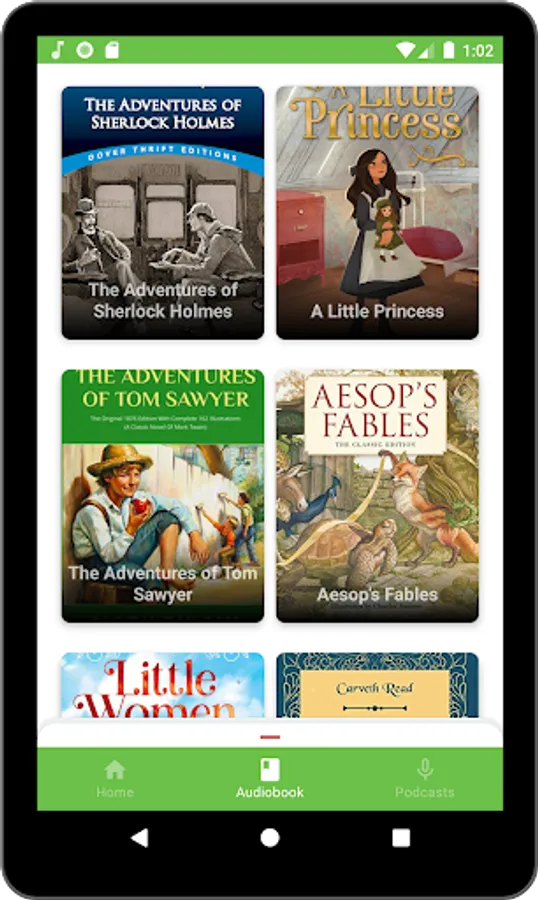 Pride and Prejudice, Moby Dick, The Adventures of Huckleberry Finn, Alice's Adventures in Wonderland, Aesop's Fables, The Adventures of Sherlock Holmes, The Art of War, Dracula, Our Island Story, The Odyssey, Romeo and Juliet, Walden, Poems Every Child Should Know, and thousands more.