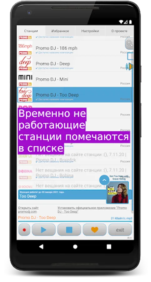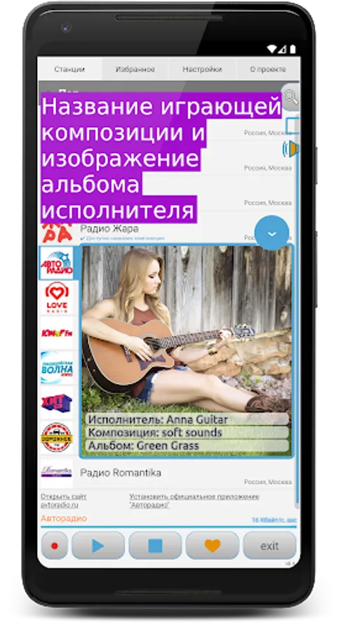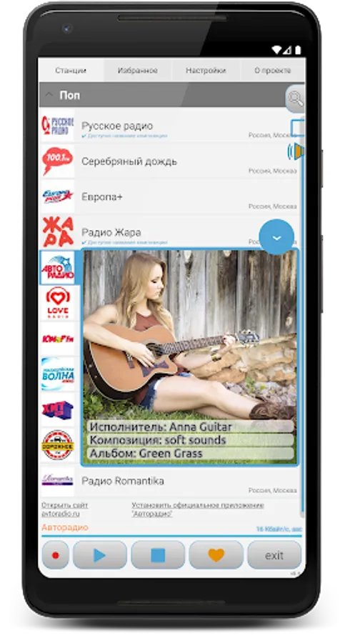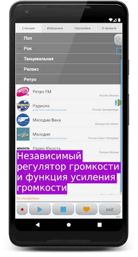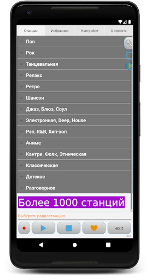 In our application you will find more than 1200 radio stations of all genres: Our music, Pop, Rock, Retro, Disco, Dance music, Chanson, Rap, R&B, Hip-hop, Jazz, Electronic, Deep, House, Ethnic, Folk, Relax, Classical music, talk radio.