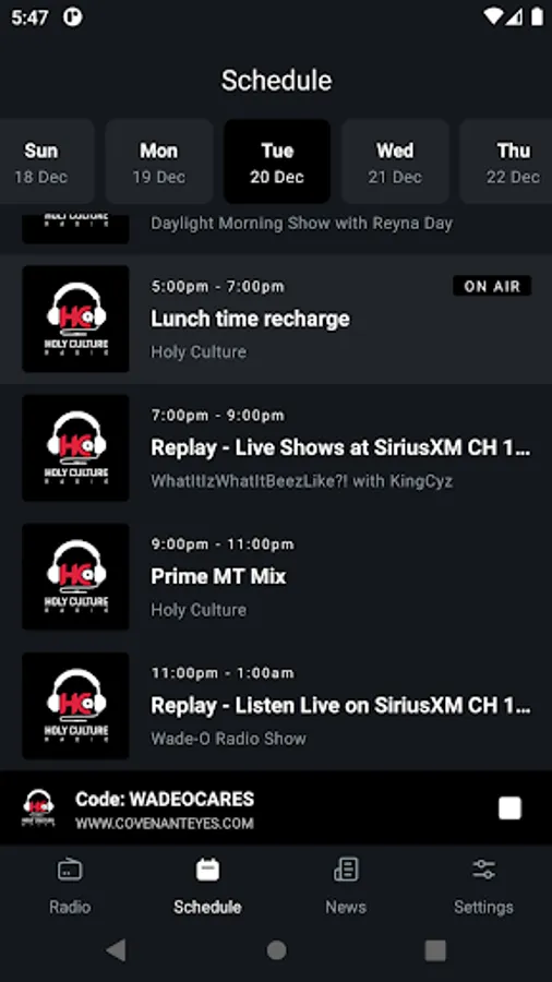 Holy Culture Radio is a full-time edutainment channel that plays faith-based rap and rhythmic music combined with empowering conversations. From introducing upcoming artists to discussions about Faith, Arts, Vocation, and Education (FAVE) with legends in the industry and more. With four daily radio shows and ten on the weekends, the diverse programming includes: