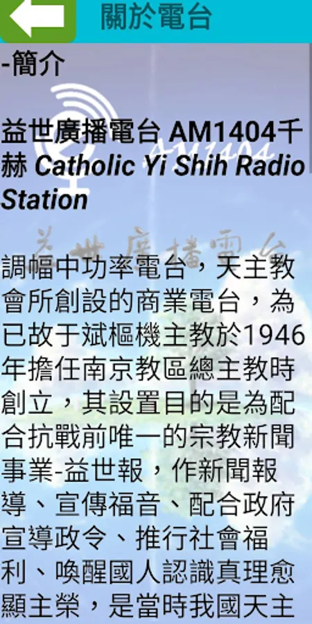 Yes Radio AM1404KHZ is an AM power station, a Catholic commercial radio station, which was founded by Cardinal Yu Bin when he was Archbishop of Nanjing in 1946. May 8, 2014, officially broadcast in the Archdiocese of Nanjing. In March 1951, the broadcasting was resumed on Ren'er Road, Keelung City. In response to local needs, there were more pronunciation programs in Min Nan, but it could not be expanded due to terrain restrictions. The current address at 75th Street.