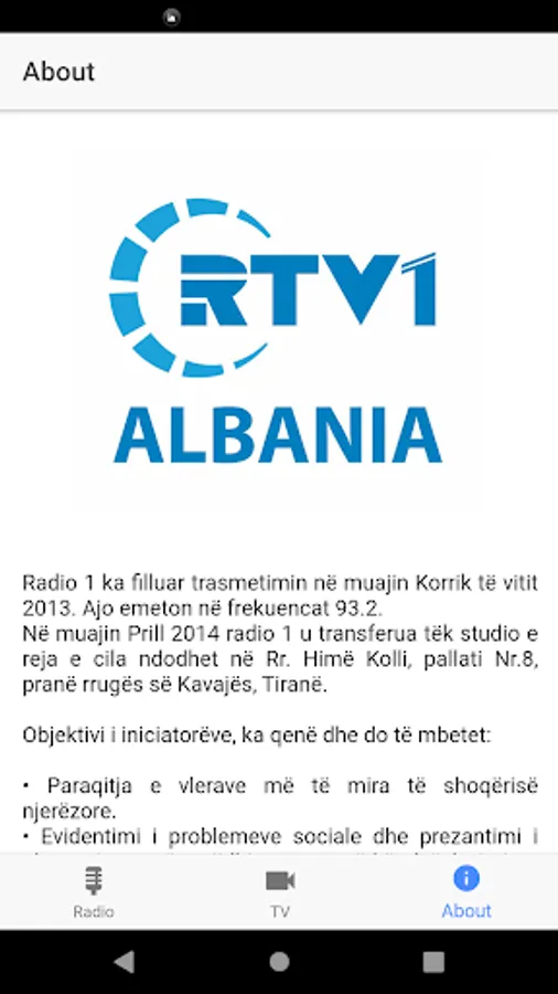 Aplikacion mobil per Android permes te cilit mund ta ndiqni live kanalin televiziv RTV1 si dhe te degjoni Radio 1.